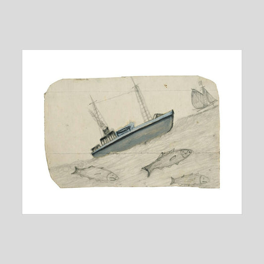 Alfred Wallis Grey steamboat, sailing ship and three fish with teeth Print