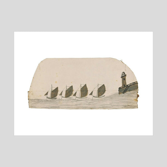 Alfred Wallis Four sailing boats leaving pier with lighthouse Print