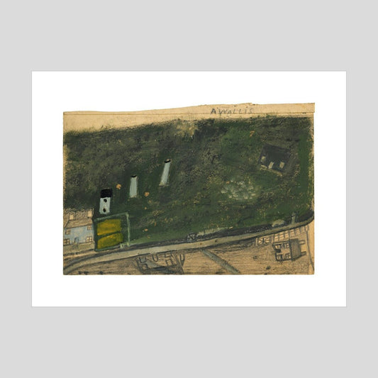 Alfred Wallis Landscape with field, chimneys and road between blue and dark green cottages (Consols Mine) Print