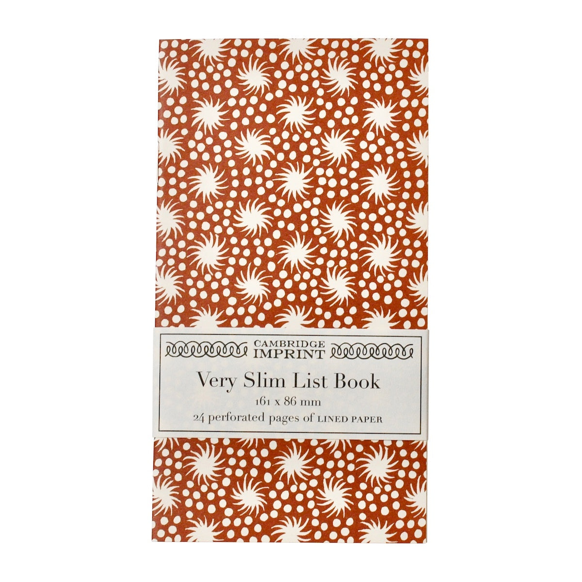 The Very Slim List Notebook by Cambridge Imprint is the ideal size for slipping into your bag for notes and shopping lists. It has 24 perforated pages of high quality lined ivory paper and the smooth card cover is litho-printed using hand-mixed colours, with the design running over the front and back.