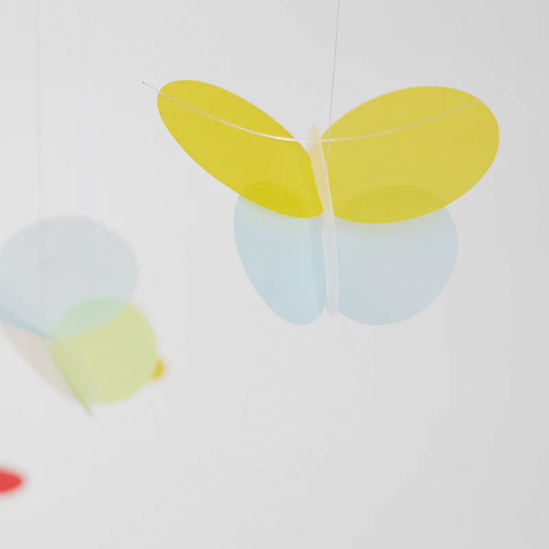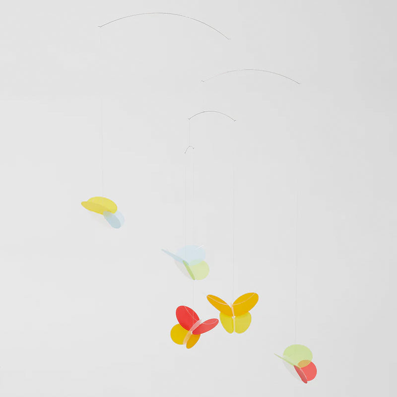 This gentle butterfly mobile brings the bright colours of the garden inside. It can hang in a sunny living room as happily as any nursery or child’s room.