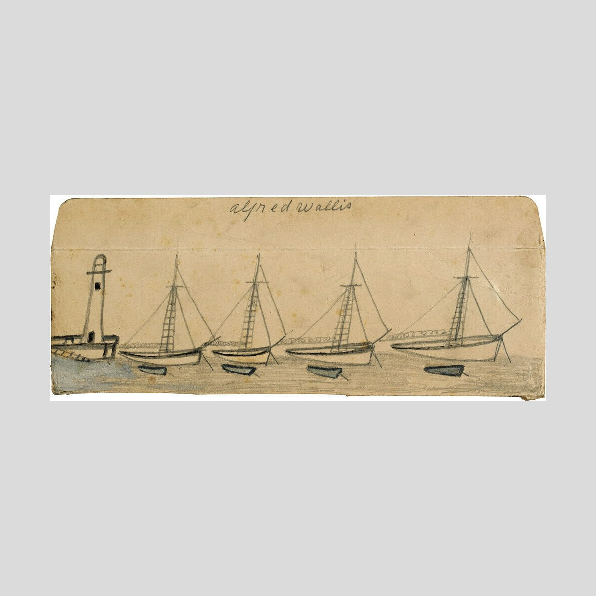 Alfred Wallis Lighthouse, four moored sailboats and rowing boats Print