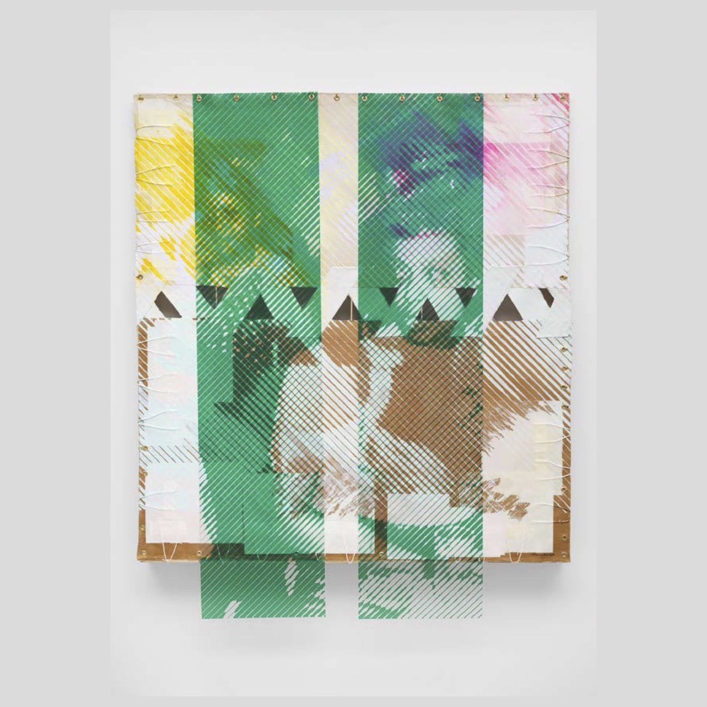 Acrylic and stained white paper bags on raw canvas, white canvas, corduroy with brass grommets and PVC vinyl strips