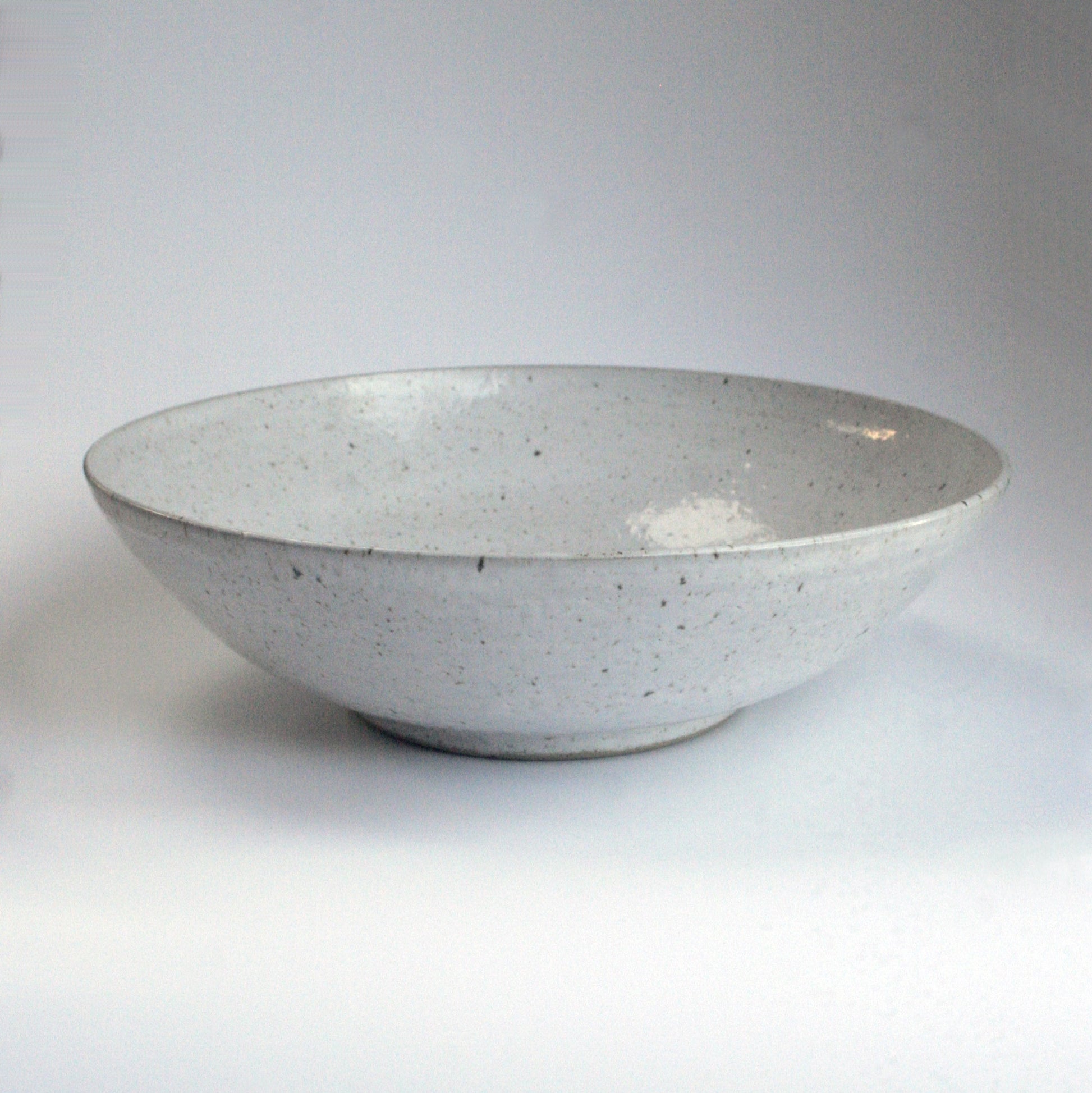 Wheel thrown serving bowl with foot ring in British stoneware clay, glazed using natural materials in gloss white with dark brown speckle.